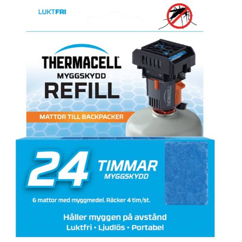 Áfylling fyrir Thermacell Backpacker. Inniheldur 6 moskítóvarnarmottur sem veita 24 klukkustunda áhrifaríka vörn gegn moskítóflugum.